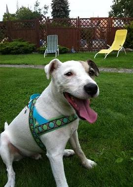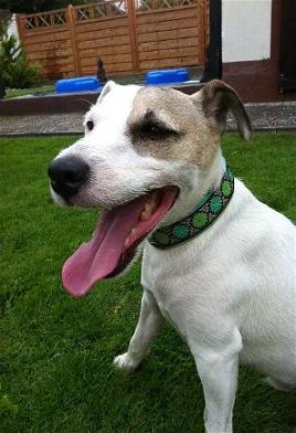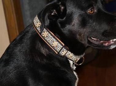 Skip mit Pinwheel-Halsband und passender Leine ![]() | Sam mit Pinwheel-Halsband ![]() |