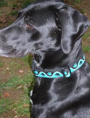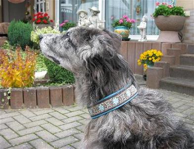 Roby mit Halsband Pfotenwelle türkis | Angie mit besticktem Halsband mit Name und Tel., Pfoten![]() |