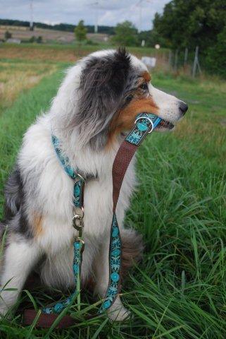 Aussie TJ mit Gucci Halsband + Kurzführer | Tyra mit Norweger-Geschirr. Borte Labelle türkis |